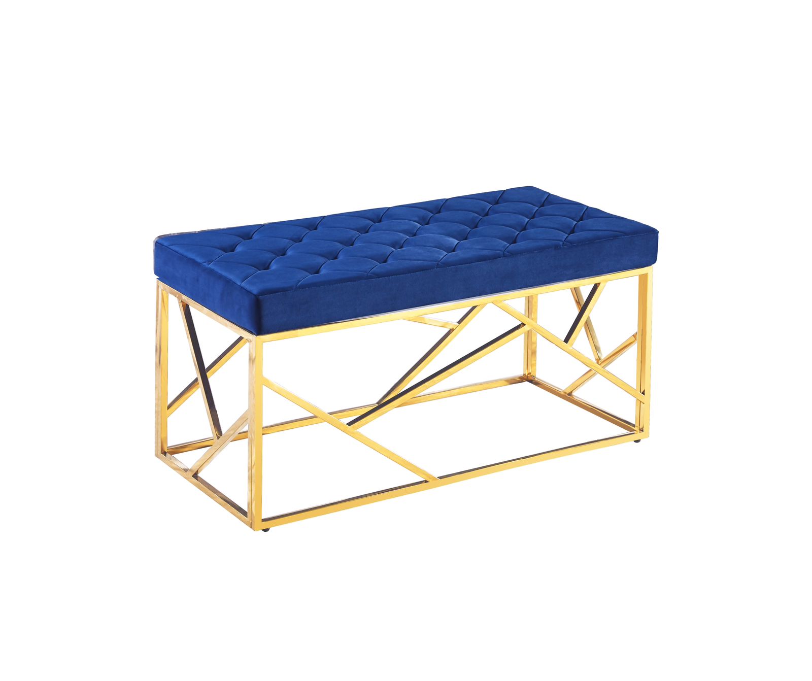 Banquette Geomag Capitonnée : élégance et confort. Cette banquette en velours bleu et or offre un siège luxueux avec capitonnage.
