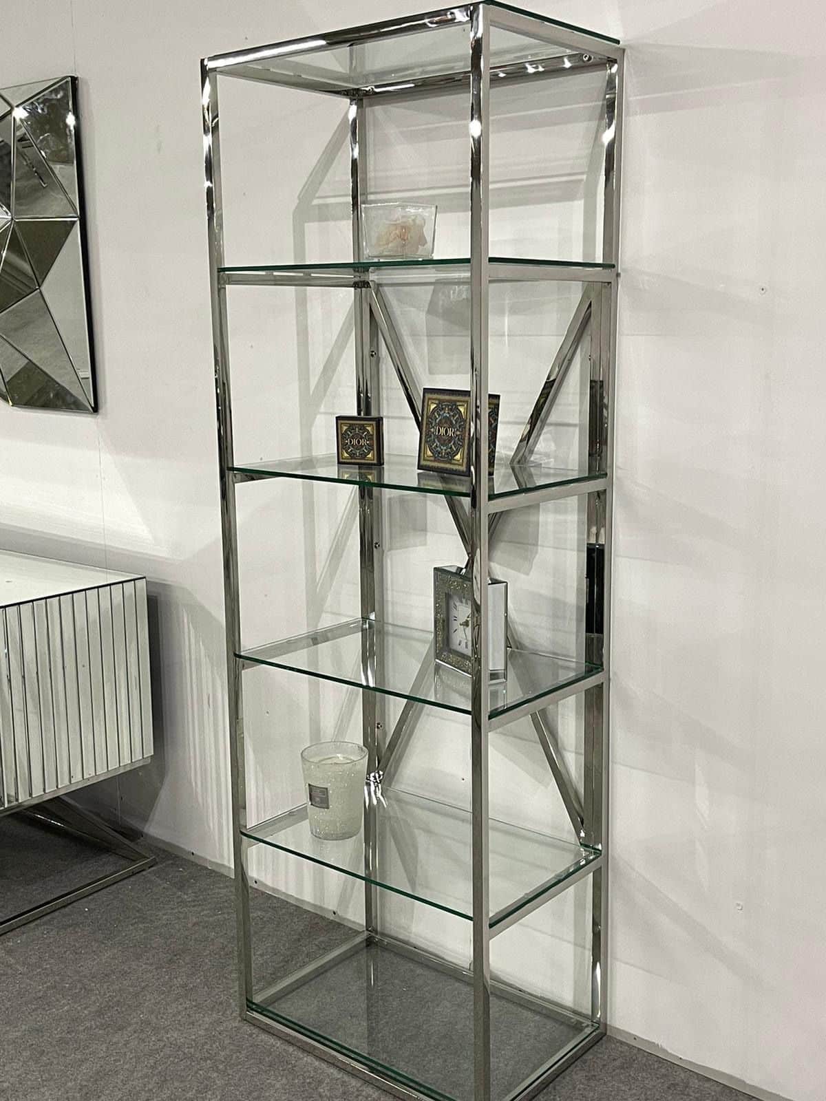 Bibliothèque Arya Inox Transparent, l’alliance parfaite de l’élégance de l’acier inoxydable et de la transparence. Sublimez votre espace avec style.
