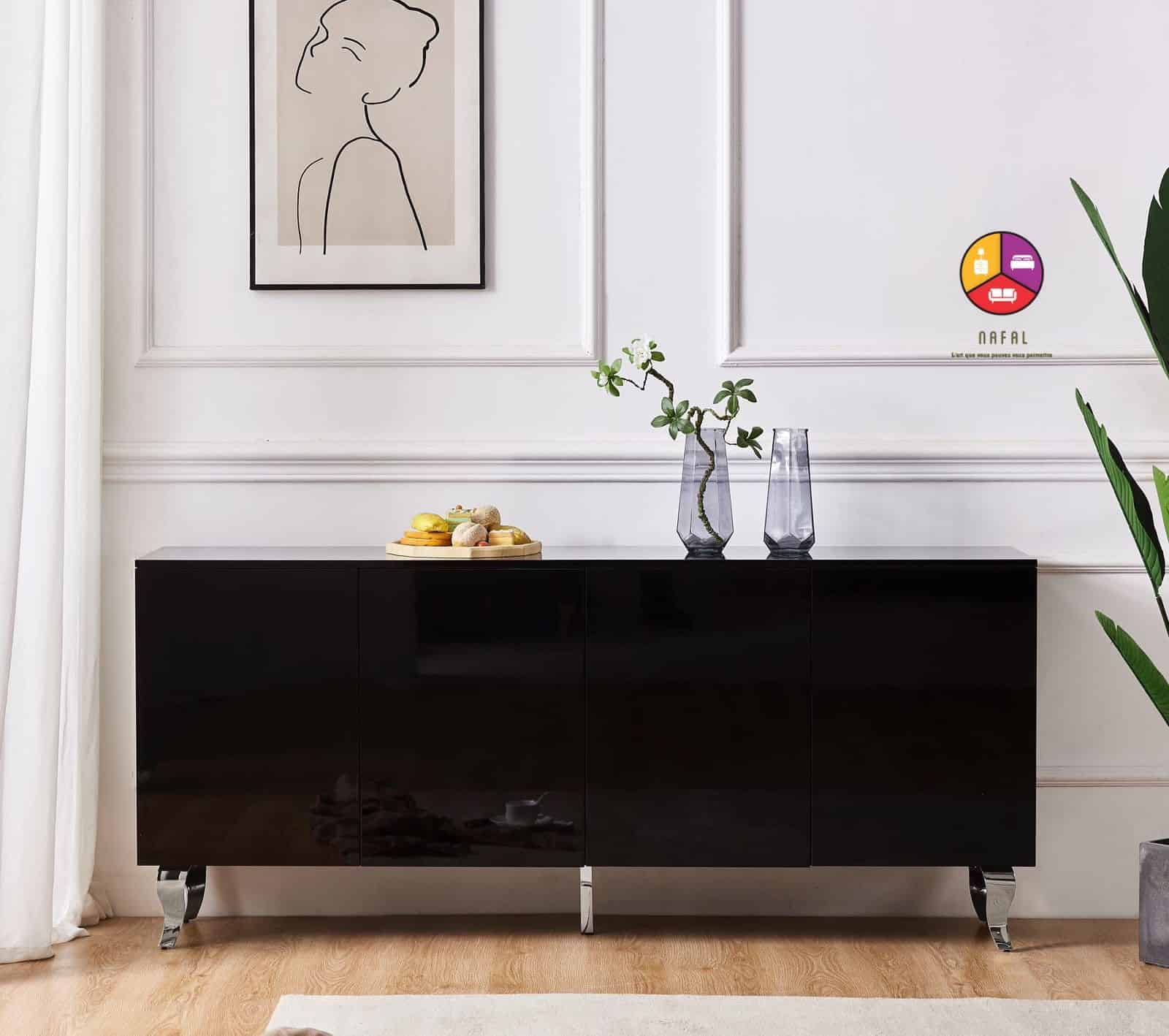 BUFFET BAROQUE LAQUE NOIR 4 PORTES PIEDS CHROME