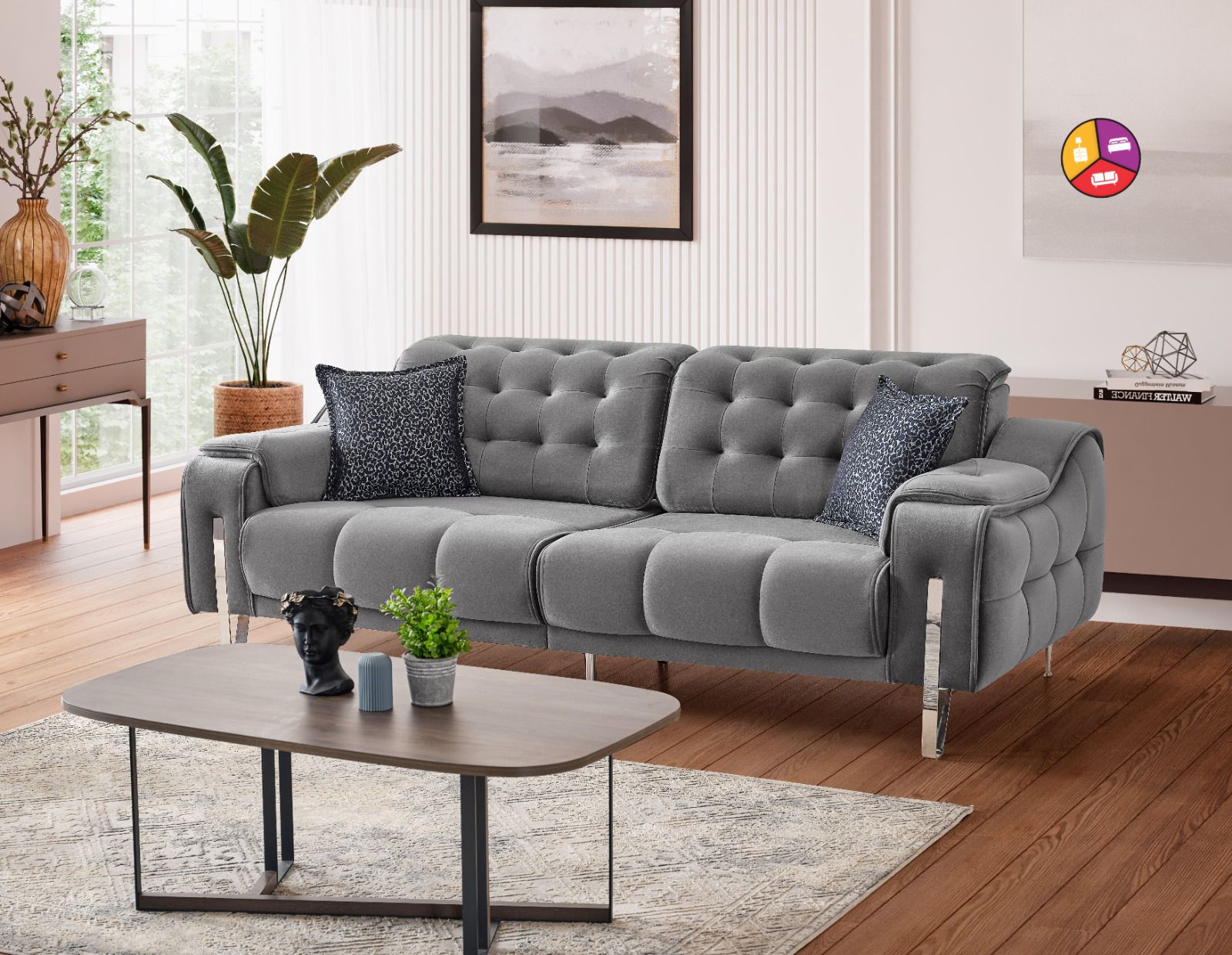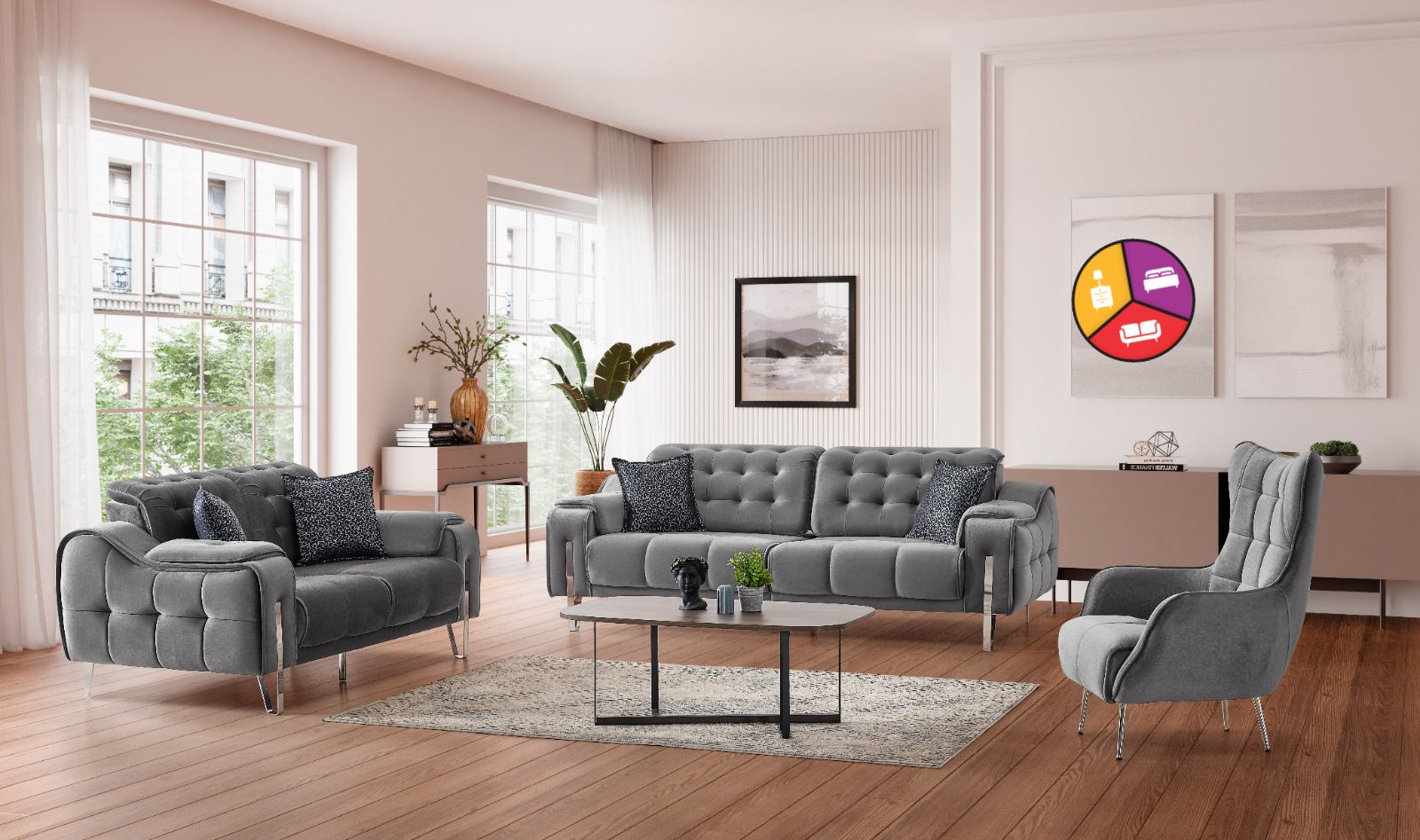 L’ensemble canapé 3+2+1 en velours gris est le choix idéal pour ceux qui recherchent à la fois un design élégant et un confort supérieur. Il comprend un canapé 3 places spacieux, un canapé 2 places intime et une chaise individuelle, créant un ensemble de salon qui marie à la perfection l’élégance et la détente.