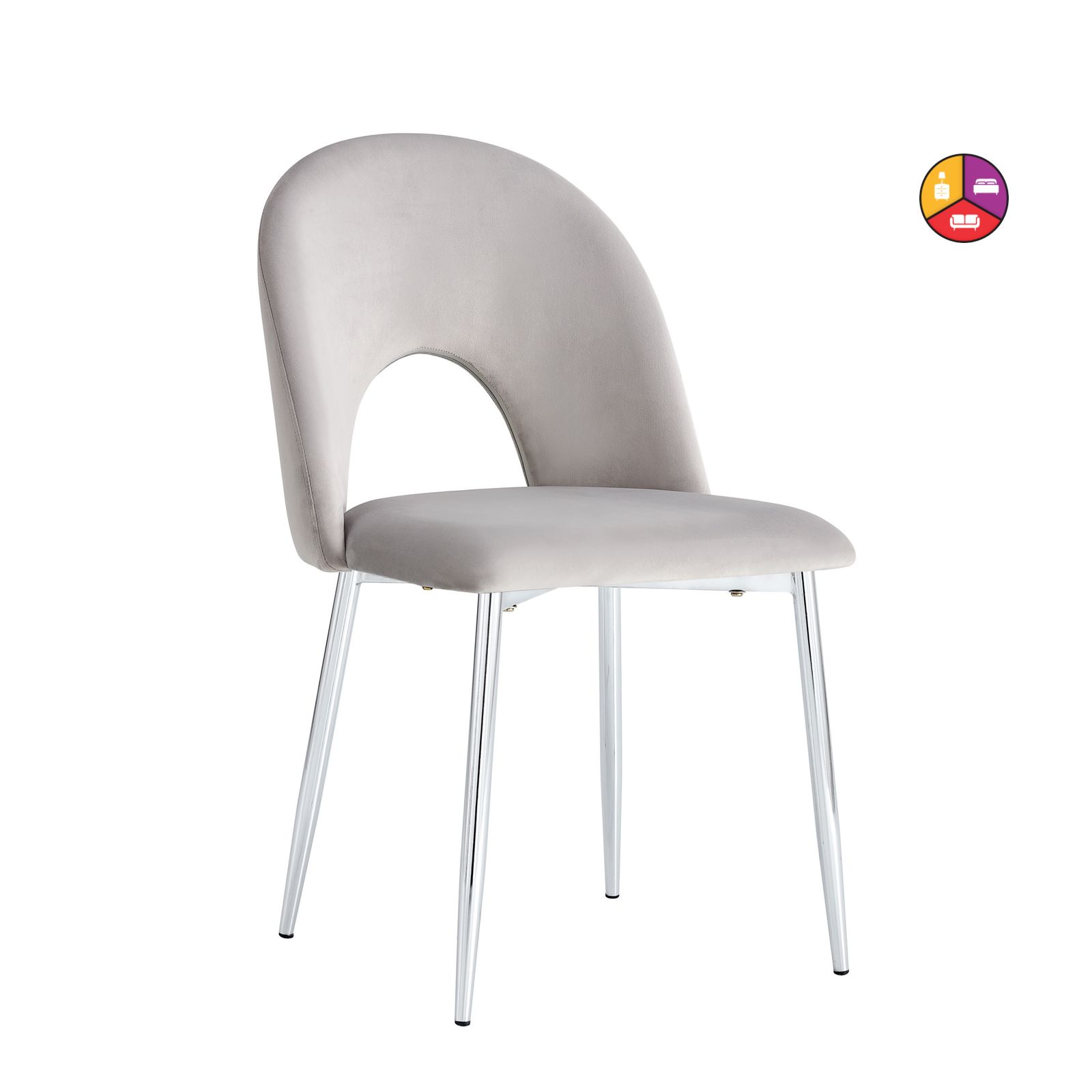 La chaise Teddy en gris avec pieds en chrome allie confort moelleux et élégance moderne, ajoutant une touche sophistiquée et contemporaine à votre espace.