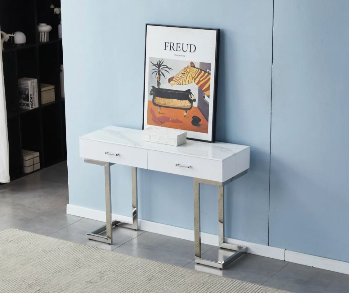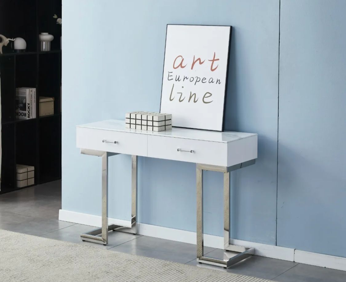 Console/coiffeuse Lila avec pieds chromés : modernité élégante. Un meuble luxueux qui rehausse l’ambiance de votre espace.