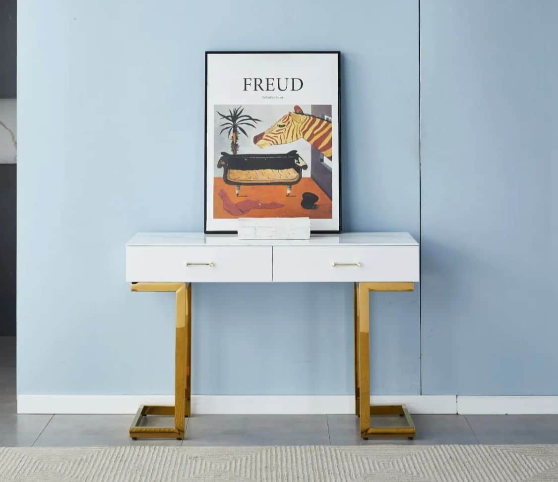 Investissez dans cette Console/Coiffeuse Lila avec pieds dorés et ajoutez une pièce d’art fonctionnelle à votre espace. Transformez votre intérieur en un lieu de luxe et de raffinement avec ce meuble qui ne manquera pas de faire sensation.