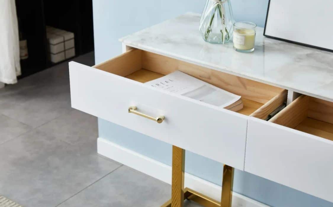 Console/coiffeuse Lila avec pieds dorés : élégance aérienne. Un meuble luxueux qui crée une ambiance sophistiquée dans votre espace.