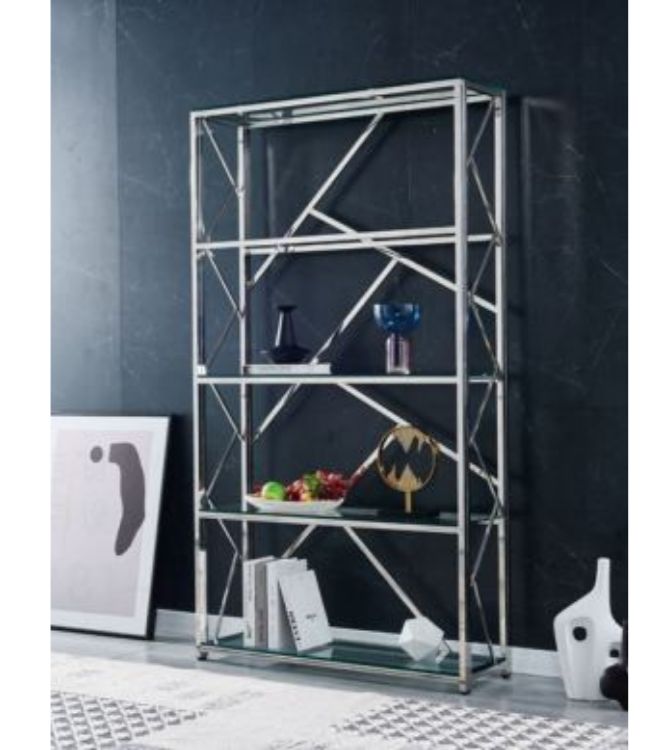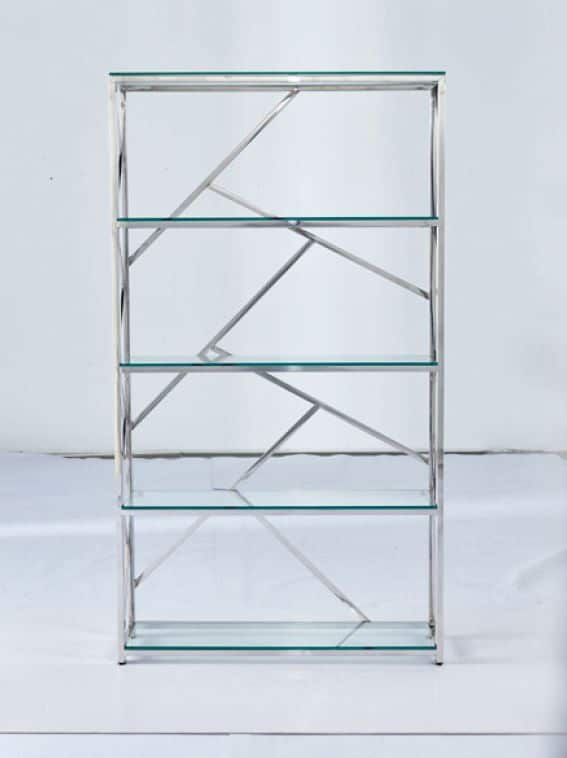 la structure en chrome poli qui évoque la qualité et la durabilité, les étagères en verre transparent qui créent une esthétique légère et aérienne, et le design géométrique contemporain qui s’intègre harmonieusement dans tout intérieur.
