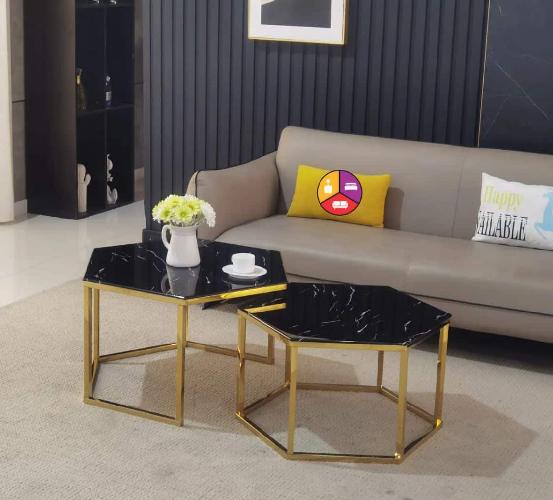 Élégance en duo avec nos tables gigognes hexagonales en marbre noir et doré. Style contemporain et fonctionnalité.