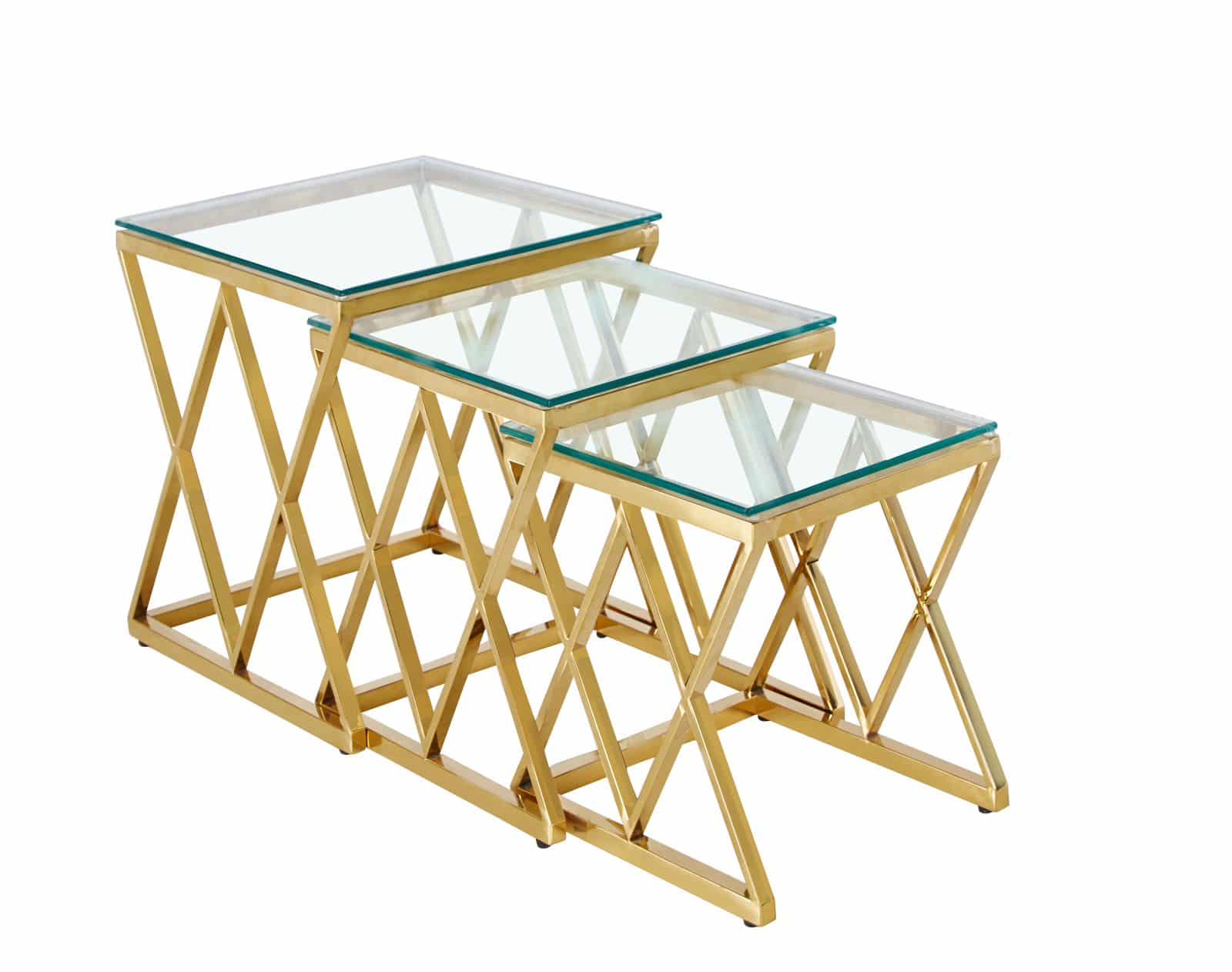 Guéridon Triple Pop en Gold : élégance et modernité. Table d’appoint avec finitions dorées et plateau en verre transparent.