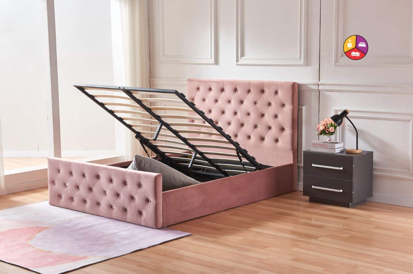Élevez votre chambre avec notre lit coffre Victoria en velours rose, capitonné et orné de diamants. Luxe et élégance.