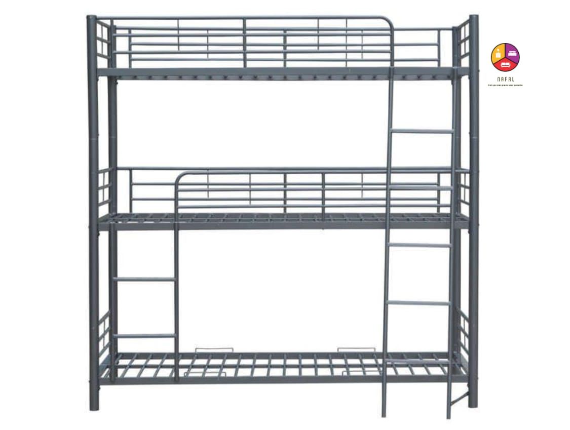 Lit superposé “Trio” en métal gris à 3 places. Économisez de l’espace avec style. Idéal pour les chambres partagées ou les dortoirs.