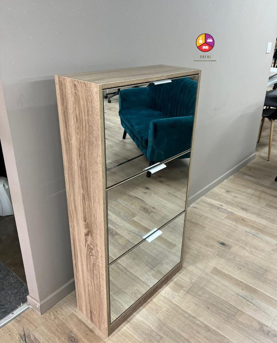 Meuble à chaussures en bois avec miroir. Élégance naturelle, rangement impeccable, design fonctionnel pour vos chaussures et un reflet impeccable.